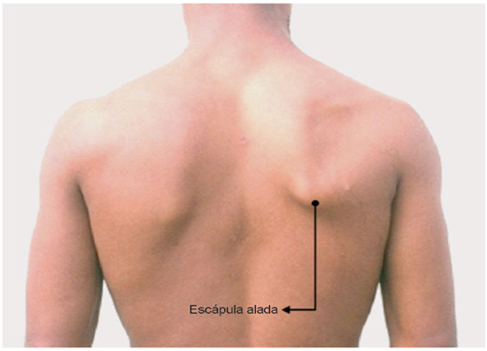 É visível a aparência da escápula, pois ela fica mais saliente no bordo medial, com aparência de uma "asa de anjo", e quando pedimos para o paciente movimentar o ombro, vemos que os dois ombros possuem movimentos diferentes, pelo fato de que os músculos entram em ação mas não harmonicamente.